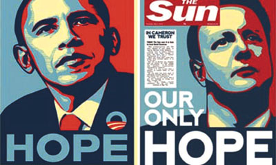 中新網(wǎng)5月7日電 據(jù)香港《文匯報(bào)》報(bào)道,英國(guó)《太陽(yáng)報(bào)》6日仿照奧巴馬2008年競(jìng)選海報(bào)設(shè)計(jì),推出支持保守黨黨魁卡梅倫的版面。