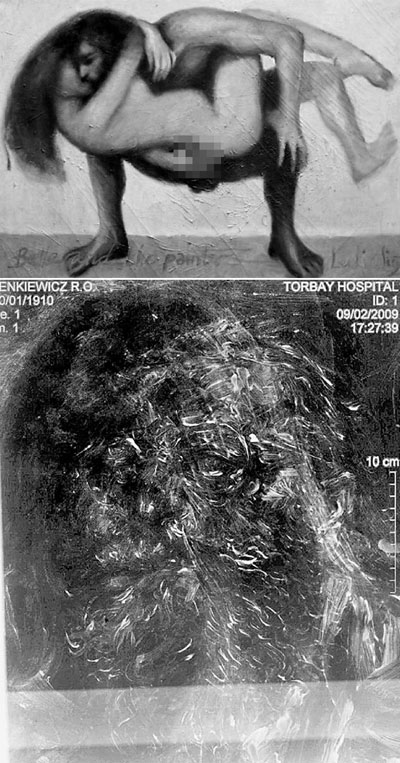 中新網(wǎng)6月23日電 據(jù)香港《文匯報》23日援引外電報道,英國一名藝術(shù)品收藏家于2003年以8500英鎊買入一幅已故畫家羅伯特-林克維科茨與女模特兒赤裸的自畫像(上圖)。該名收藏家聽取專家意見,把畫拿去醫(yī)院進行X光掃描,竟發(fā)現(xiàn)畫中有畫,油畫之下蓋另一幅流浪漢肖像畫(下圖),之前從未被拍賣過,估計價值逾5萬英鎊。收藏家相信羅伯特-林克維科茨用畫蓋另一幅畫是另有目的。