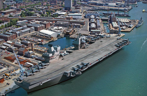 這張由電腦模擬的圖片旨在使人們大體了解2015年將“服役”的新一代戰(zhàn)艦的外型。圖片顯示,該航母停泊在英國樸次茅斯海軍基地,長度超過3個碼頭的長度。如果建造成功,將成為“英國設(shè)計和建造的有史以來體型最大的、功能最強(qiáng)大的軍艦”。預(yù)計這艘航母寬70米,飛行甲板面積足有49個網(wǎng)球場或3個足球場那么大,能同時搭載40架飛機(jī)。