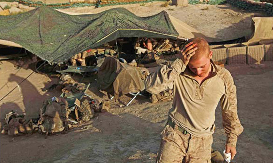 這個觀察哨名為“巖石”,就位于赫爾曼德省哈!ぐ偷卵策壔貣|南部幾百米處,在過去幾個月中,這里一直有2到8名海軍陸戰(zhàn)隊士兵駐扎。這里是一個孤獨暴露的20米高地,2008年夏季被美軍占領。士兵們不僅需要忍受38攝氏度的高溫,還要全天候輪班守衛(wèi),眼睛時刻盯著沙袋之間的射擊孔,消遣就是看雜志和去臨時體育館,每個周日早晨,通常會受到塔利班的輕武器和火箭彈的襲擊。