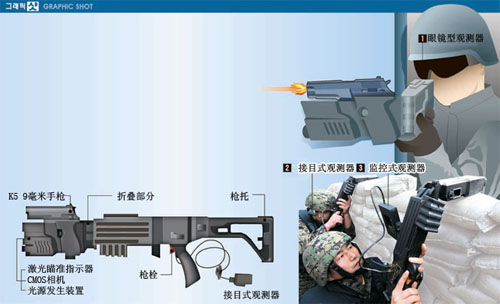 拐角槍是將既有步槍的槍身折疊后,在槍的末端安裝口徑9毫米的K5手槍。為能夠確認墻外的目標并瞄準,安裝了數碼相機和激光目標指示器。據此,戰(zhàn)斗兵在墻后擺好拐角槍,通過觀看數碼半導體相機拍攝的影像對準激光目標指示器然后進行射擊。有效射程為50米,可左右折疊60度進行自由射擊。應用于實戰(zhàn)還將需要1到2年的時間。