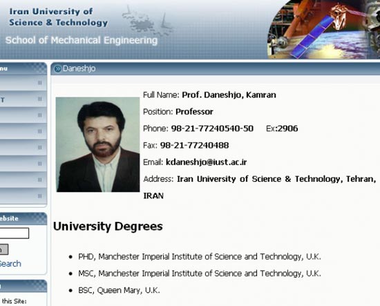 根據(jù)戴尼斯鳩的官方自傳,他曾在英國“倫敦學院”獲得航空和航天工程博士學位。問題是,英國根本就沒有這樣一所大學。Mowjcamp推測說,戴尼斯鳩的意思可能是指英國“帝國理工大學”,那所學校確實有航空學院。但戴尼斯鳩在德黑蘭工業(yè)科技大學網站上的簡歷卻與此不同,網上說,他在瑪莉皇后學院(倫敦大學的最大學院之一)獲得學士學位。