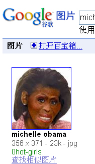 中新網(wǎng)11月25日電 據(jù)美國(guó)媒體報(bào)道,近日有網(wǎng)民發(fā)現(xiàn),在Google圖片搜索中輸入奧巴馬夫人的名字Michelle Obama時(shí),第一張彈出來(lái)的照片竟遭人丑化,米歇爾被PS成了猩猩臉。