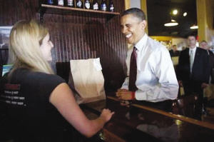 據(jù)法新社消息,美國總統(tǒng)奧巴馬13日在紐約州布法羅時,突然造訪當?shù)匾患乙猿鍪邸八3抢彪u翅”而聞名的小吃店。一名女店員由于見到奧巴馬過度緊張和興奮,竟一時口誤,用了極其不雅的詞匯稱贊奧巴馬是“帥哥”。