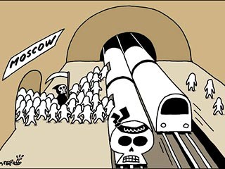 這篇題為“莫斯科地鐵襲擊”的漫畫發(fā)表在“觀點(diǎn)(Opinion)”欄目?jī)?nèi)。漫畫將地鐵車頭被畫成“骷髏頭”,額頭還綁著類似阿拉伯文的黑布。急著上地鐵的乘客被畫成白色,人彈被畫成手拿鐮刀的黑色死神。