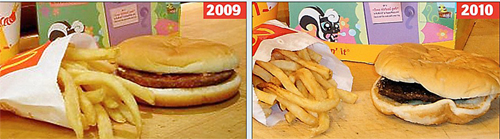 中新網(wǎng)3月20日電 同一份麥當(dāng)勞“開心樂園餐”,相隔12個月拍下的兩張照片,看起來竟然幾乎一模一樣。據(jù)香港《文匯報》報道,一般來說,放了一年的食物應(yīng)該發(fā)霉或分解成一堆廢料,但麥當(dāng)勞兒童餐卻幾乎沒有腐壞,只是漢堡牛扒萎縮和不新鮮的漢堡面包干裂。