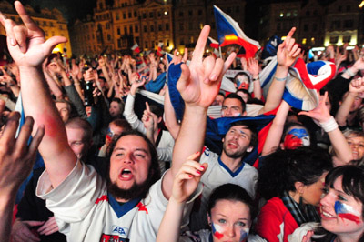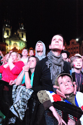 數(shù)千名球迷23日晚上聚集在布拉格市中心老城廣場(chǎng)觀看球賽的電視實(shí)況轉(zhuǎn)播,捷克隊(duì)最終取勝后人們一片歡騰。(黃頻)