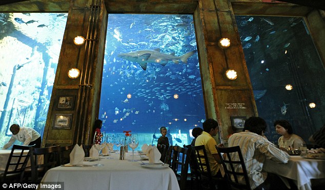當(dāng)你在船尾這家涼爽昏暗的角落,大嚼著生猛海鮮,這家海洋樂園著名的鯊魚,會從你就餐的窗戶外遨游而過。