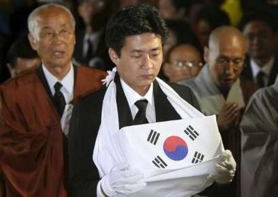 盧武鉉的國民葬遺體告別儀式29日在首爾景福宮舉行。韓國總統(tǒng)李明博、前總統(tǒng)金泳三和金大中、現(xiàn)任、前任政府高級官員,外國駐韓使節(jié)以及海外吊唁使節(jié)、遺屬以及葬禮委員會成員等三千多名人士參加了遺體告別儀式。