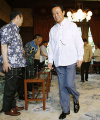 據(jù)日本共同社報(bào)道,麻生身穿沖繩縣知事仲井真弘多贈(zèng)送的白色長(zhǎng)袖清涼裝在眾人面前亮相。消費(fèi)者行政擔(dān)當(dāng)相野田圣子在會(huì)后的記者會(huì)上夸獎(jiǎng)道:“首相穿得最清爽”。沖繩北方擔(dān)當(dāng)相佐藤勉還在記者會(huì)上為沖繩夏裝做了宣傳,稱“內(nèi)閣會(huì)議因此而變得五彩繽紛”。