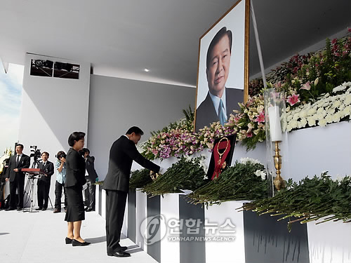 李明博當天與夫人金潤玉女士和青瓦臺政務首席秘書孟亨奎、發(fā)言人李東官一同進行了吊唁。