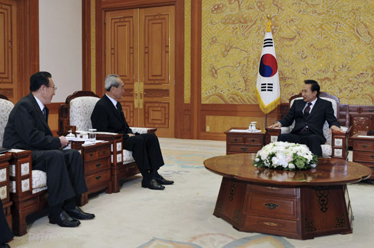 中新網(wǎng)8月23日電 綜合韓聯(lián)社等媒體報(bào)道,韓國總統(tǒng)李明博23日上午在青瓦臺(tái)接見了前來吊唁韓國前總統(tǒng)金大中的朝鮮吊唁團(tuán)。