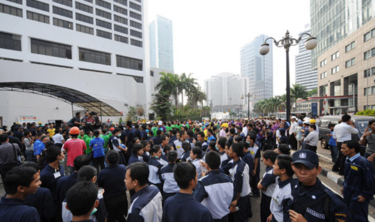 在首都雅加達,群眾紛紛涌上街頭躲避,上班族也從辦公大樓中相繼撤離!