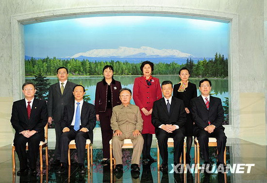 金正日首先與代表團(tuán)合影留念。他請王家瑞轉(zhuǎn)達(dá)對胡錦濤總書記等中國黨和國家領(lǐng)導(dǎo)人的親切問候,并熱情地向中國人民拜年。他說,去年是朝中建交60周年,雙方圍繞“朝中友好年”所舉辦的一系列交流活動,向世人、特別是兩國年青一代展示了朝中友誼的旺盛活力。當(dāng)前雙邊關(guān)系很好,今后會發(fā)展得越來越好。
