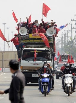 據(jù)報(bào)道,尤其是在曼谷皇家田廣場一帶,到處都可見紅衫軍的車隊(duì)和旗幟。12日,“反獨(dú)裁民主聯(lián)合陣線”先進(jìn)行熱身,在市內(nèi)6處地點(diǎn)進(jìn)行集會,作為14日大集會的前奏。