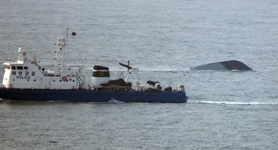 韓國海軍和海警消息人士表示,在攝氏8至10度的水溫中,落水者通?梢源婊3個小時,其后便兇多吉少,為了搶救更多人命,海軍正徹夜全力搜索。
