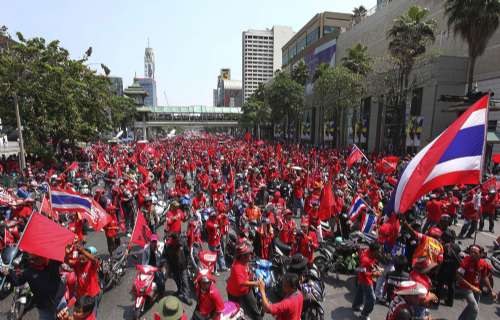 紅衫軍在旅游熱點(diǎn)四面佛附近架起講臺(tái)集會(huì),他們站滿(mǎn)馬路、天橋和百貨公司前的廣場(chǎng),領(lǐng)袖揚(yáng)言徹夜示威,直至重新大選。