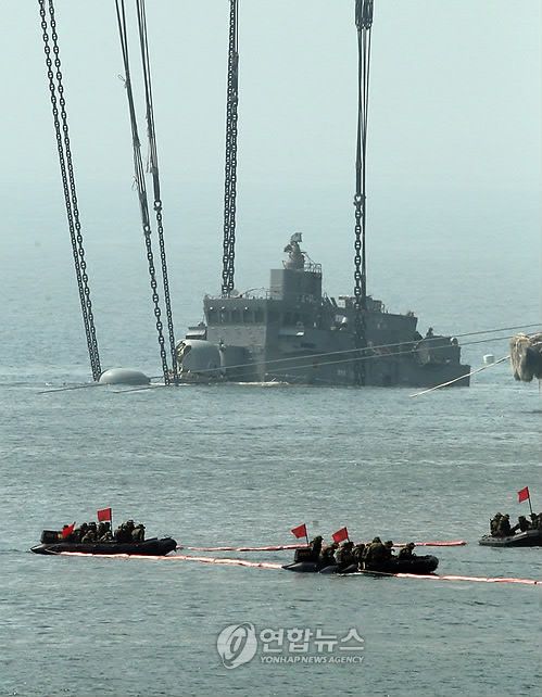 中新網(wǎng)4月23日電 據(jù)韓聯(lián)社報(bào)道,韓國軍方和打撈公司從當(dāng)?shù)貢r間23日上午8點(diǎn)49分起,開始把“天安”艦船頭扶正。未過多時,往右邊傾斜的船頭漸漸浮出水面,露出寫著“天安”艦識別編號“772”的部位和艦橋。