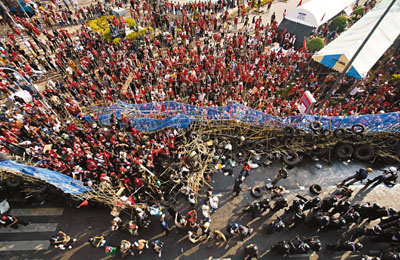榴彈襲擊翌日,數(shù)百名防暴警察手持盾牌警棍,沒(méi)有攜帶槍械,向購(gòu)物區(qū)的紅衫軍集結(jié)點(diǎn)推進(jìn)。紅衫軍用尖竹和車(chē)胎堆成3米高的路障,并灑上汽油,迫使警方退后。紅衫軍后來(lái)答應(yīng)警方要求,后退100米,但并未拆除路障。