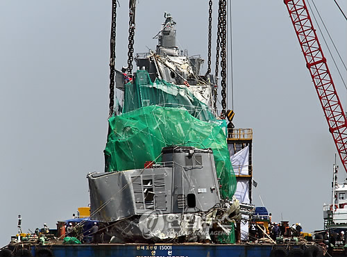 被吊至駁船上,在進(jìn)行固定之后,韓國(guó)海難救援隊(duì)(SSU)將進(jìn)入艦艇內(nèi),進(jìn)行遺體找尋工作。與此同時(shí),軍民聯(lián)合組成的調(diào)查團(tuán)將開(kāi)展事故原因的調(diào)查工作。