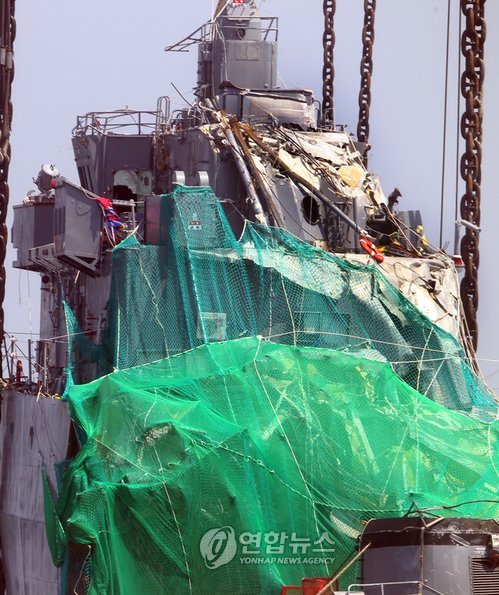 由韓國軍民聯(lián)合組成的天安艦打撈組,在沉艦20天和29天后成功打撈了艦尾和艦首。104名官兵當中58名獲得拯救,失蹤6人,40人罹難。