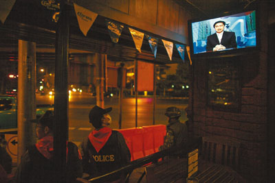 另一方面,阿披實(shí)政府并未放棄驅(qū)離紅衫軍計(jì)劃,解決緊急情勢(shì)中心發(fā)言人訕森表示,估計(jì)拉差巴頌路口仍有6000至8000名紅衫軍,當(dāng)局正出動(dòng)裝甲車驅(qū)散駛向該區(qū),執(zhí)行驅(qū)散行動(dòng)。主管安全事務(wù)的副總理素貼表示,參加集會(huì)的示威者應(yīng)該認(rèn)識(shí)到,他們已成為恐怖分子的人肉盾牌,呼吁民眾應(yīng)離開集會(huì)現(xiàn)場(chǎng),并稱如果他們拒絕,政府將采取強(qiáng)力措施恢復(fù)秩序。