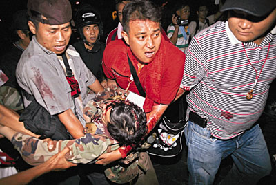 中新網(wǎng)5月14日電 據(jù)香港《文匯報(bào)》14日?qǐng)?bào)道,泰國(guó)局勢(shì)再趨緊張,反政府紅衫軍拒絕結(jié)束示威,總理阿披實(shí)收回11月大選的和解提議。軍方昨(13日)晚出動(dòng)裝甲車(chē)狙擊手封鎖紅衫軍示威地點(diǎn),并截水截電,圖逼走示威者。紅衫軍營(yíng)地之后傳出連串槍聲和至少4下爆炸聲,據(jù)報(bào)造成至少1死20傷,其中支持紅衫軍的陸軍少將卡迪亞頭部中槍昏迷。當(dāng)局宣布擴(kuò)大在中部和東北部17個(gè)府實(shí)施緊急事態(tài)法。