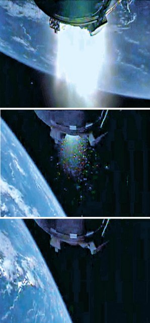 韓國方面公布的這三張照片,分別是兩段火箭的引擎正常點火發(fā)動的照片(上)、兩段火箭的燃素即將熄滅時的照片(中)和航天器因火箭上段未能正常分離的整流罩而偏離軌道的照片(下)。