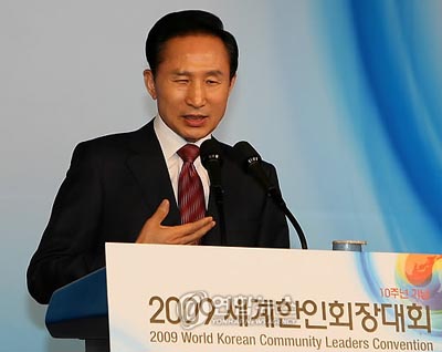 李明博當天出席在首爾的華克山莊舉行的2009年世界韓人會長大會,通過賀詞說出了此番話。