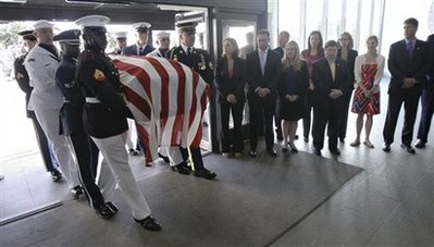 肯尼迪家族發(fā)言人表示,愛德華的遺體27日由寓所運(yùn)到波士頓的約翰-肯尼迪圖書館,需時(shí)至少兩個(gè)小時(shí),途中經(jīng)過多個(gè)對(duì)愛德華有重要意義的地方,周五開放給公眾瞻仰,翌日將安葬于阿靈頓國家公墓,毗鄰他的胞兄約翰和羅伯特的墓地。