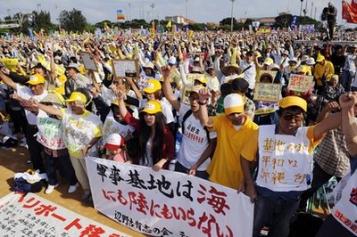 中新網(wǎng)4月26日電 據(jù)日本“共同社”網(wǎng)站報(bào)道,反對(duì)美軍普天間機(jī)場縣內(nèi)搬遷、向日美雙方政府要求將機(jī)場遷至沖繩縣外或國外的沖繩縣民集會(huì)25日下午在該縣讀谷村舉行。主辦者稱約有9萬人參加了集會(huì)。這是各黨派首次就普天間問題舉辦集會(huì)活動(dòng)。沖繩縣知事仲井真弘多在發(fā)言中表示“希望政府能出示負(fù)責(zé)任的解決方案,遵守眾院選舉時(shí)的承諾”,要求改善基地負(fù)擔(dān)集中于沖繩的現(xiàn)狀。