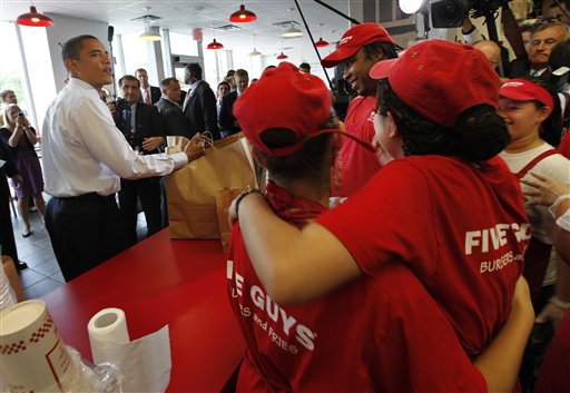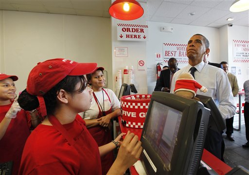 據(jù)《星島日報》報道,奧巴馬到華盛頓一家連鎖快餐店買漢堡包,期間又與市民握手問好,他點(diǎn)了芝士漢堡包及薯條作午餐,還請下屬進(jìn)食,以及隨行拍攝的電視臺職員。在排隊期間,奧巴馬吃了點(diǎn)零食,與其他顧客聊天,也有人要求與他拍照留念。