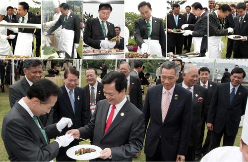 在蒙蒙細雨中東盟領(lǐng)導人手舉雨傘進入了午宴會場,而李明博戴著手套、身穿圍裙在炭爐前親自烤肉,吸引了各國領(lǐng)導人的目光。
