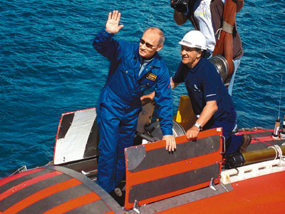 根據(jù)國(guó)營(yíng)電視臺(tái)發(fā)出的照片,可見(jiàn)身為柔道黑帶高手的普京身穿藍(lán)色工作服,攀上Mir-1潛艇開(kāi)始航程。普京在船艙表示:“這次潛水很順利,視野在燈光下很好!钡麑(duì)水顯得污濁有微言:“從生態(tài)角度看這些水當(dāng)然干凈,但事實(shí)上這是浮游生物湯,起碼我是這樣叫它!