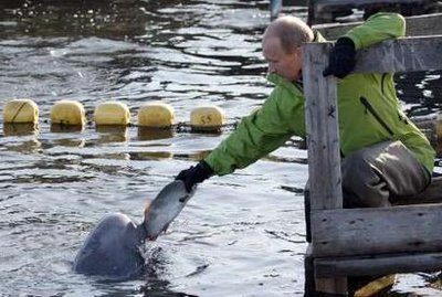 除了展現(xiàn)男子氣概,普京近年亦用心營(yíng)造柔情一面。俄政府發(fā)聲明表示,普京7月31日到了俄羅斯遠(yuǎn)東地區(qū),穿起潛水衣,在太平洋的契卡洛夫島為一條白鯨裝上衛(wèi)星追蹤器。這是一個(gè)白鯨遷徙模式研究的一部分。普京當(dāng)時(shí)問(wèn):“她不會(huì)咬人吧?”他其后更幫手喂飼其他白鯨。普京當(dāng)日又到700公里外的哈巴羅夫斯克市,出席一條新天然氣輸氣管的啟用儀式。