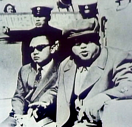 中新網(wǎng)8月28日電 據(jù)韓國《中央日?qǐng)?bào)》28日?qǐng)?bào)道,朝鮮中央電視臺(tái)25日播放了講述朝鮮國防委員長(zhǎng)金正日生平的紀(jì)錄片《照耀世界的先軍太陽》第一部。圖片顯示,金委員長(zhǎng)在金日成綜合大學(xué)念大二時(shí)的1961年,他陪伴金日成主席(1994年去世)前往大德山軍隊(duì)進(jìn)行現(xiàn)場(chǎng)指導(dǎo),坐在旁邊的位置上。這是金日成父子首次一起進(jìn)行現(xiàn)場(chǎng)指導(dǎo)的場(chǎng)面。