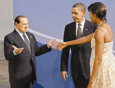 據(jù)香港《文匯報(bào)》報(bào)道,晚宴上,奧巴馬夫婦以東道主身份負(fù)責(zé)迎賓,被意大利媒體稱為“性上癮”的老貝見到美國(guó)第一夫人米歇爾時(shí)顯得相當(dāng)高興,伸出雙臂示意互相擁抱。誰(shuí)知米歇爾遠(yuǎn)遠(yuǎn)伸出一只手,示意握手打招呼,令場(chǎng)面顯得很尷尬。更值得注意的是,站在一旁的奧巴馬一臉冷漠,斜睨老貝,顯得十分警惕。