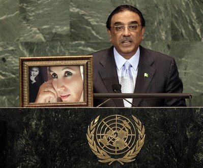 中新網(wǎng)9月27日電 巴基斯坦總統(tǒng)扎爾達里在聯(lián)合國大會上演講時,把他的已故夫人貝-布托和岳父布托的照片擺上演講臺,并吁請世界各國為巴國打擊恐怖主義和宗教極端主義提供更多協(xié)助。