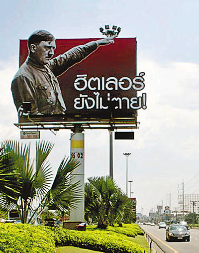 據(jù)悉,希特勒廣告牌于兩周前豎起,是為當(dāng)?shù)芈芬讏D索蠟像館下月開張做的宣傳。該廣告牌位于進(jìn)入芭堤雅的主要高速路旁,希特勒的畫像與廣告牌上的泰文廣告語“希特勒未死“十分醒目。廣告牌豎起以來,泰國方面已經(jīng)接到100多宗投訴和德國、以色列等國大使館的抗議信。