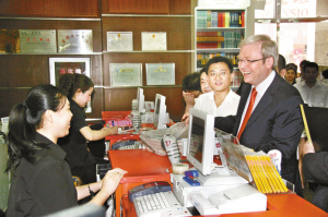 “澳大利亞總理喜歡有關(guān)中國(guó)傳統(tǒng)文化的圖書”,記者近日從北京發(fā)行集團(tuán)獲悉,8月8日上午,前來(lái)北京參加第29屆奧運(yùn)會(huì)開(kāi)幕式的澳大利亞總理陸克文在澳大利亞駐華大使芮捷銳博士的陪同下走進(jìn)王府井書店選購(gòu)圖書。