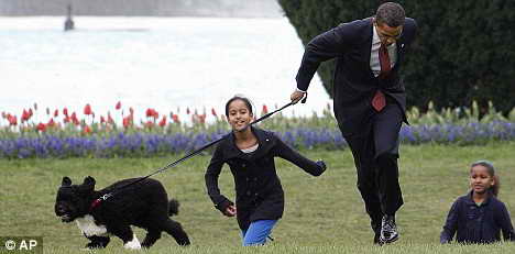 六個(gè)月大的葡萄牙水犬“波”的奔跑速度很快,這使奧巴馬一家人不得不加快步伐。當(dāng)“波”在駐白宮媒體記者前亮相時(shí),它再次展示出有自己的思考能力,試圖從記者面前逃走。奧巴馬開玩笑說:“這里有點(diǎn)壓力!彼S后披露稱,“波”喜歡吃西紅杮,第一夫人米歇爾的蔬菜園現(xiàn)在有危險(xiǎn)了。奧巴馬還為“波”入住白宮定了一些規(guī)則。當(dāng)被問及“波”將在何處睡覺時(shí),奧巴馬稱,“波”將不會(huì)睡在他的床上。他說:“我們得輪流去遛狗,它是一個(gè)明星!眾W巴馬的女兒馬莉婭和薩莎在與“波”玩耍時(shí)露出笑容。薩莎稱,盡管“波”是葡萄牙水犬,但它不會(huì)游泳。奧巴馬稱:“是的,很顯然,它得學(xué)會(huì)如何游泳!