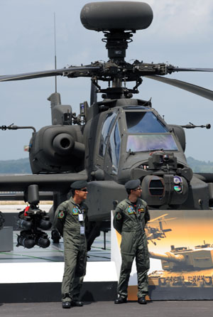 在新加坡航展上,俄羅斯沒有帶來什么吸引眼球的新產(chǎn)品。而美國則同印度防務展一樣,多家企業(yè)拿出拳頭產(chǎn)品。除已經(jīng)被世人所熟知的F-15、F-16戰(zhàn)斗機、AH-64“長弓阿帕奇”武裝直升機和V-22偏轉翼飛機等航展常客外,美國還推出了最新的第四代戰(zhàn)機F-35“閃電Ⅱ”。洛克希德-馬丁公司希望借此向亞太國家推銷500架左右的F-35,初步意向為日本、韓國、澳大利亞和新加坡四個買家。