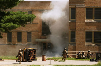 美國(guó)印第安納州馬斯喀特塔特城市訓(xùn)練中心便有這樣一種使用好萊塢效果打造的反恐戰(zhàn)爭(zhēng)體驗(yàn)營(yíng)。當(dāng)?shù)鼐觳筷?duì)、國(guó)家武裝部隊(duì)都曾經(jīng)受過(guò)它的實(shí)地考驗(yàn)。近日,訓(xùn)練營(yíng)又迎來(lái)了美國(guó)海軍陸戰(zhàn)隊(duì)第26遠(yuǎn)征軍的一批士兵。