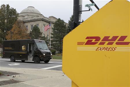 11月11日,美國維明頓,一輛UPS運(yùn)送車駛過一個(gè)DHL投遞箱。