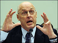 美國財(cái)政部長保爾森在國會(huì)聽證會(huì)上答辯。