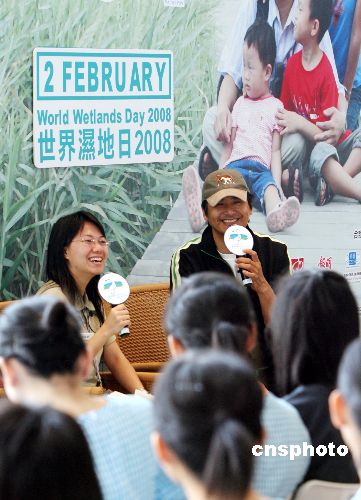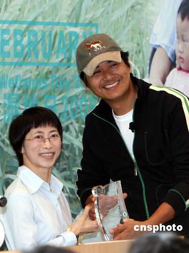 十月二十日,國(guó)際影視巨星周潤(rùn)發(fā)在香港濕地公園舉行的世界濕地日2008香港區(qū)慶祝活動(dòng)啟動(dòng)儀式上,獲頒濕地保育大使委任狀。中新社發(fā) 武仲林 攝