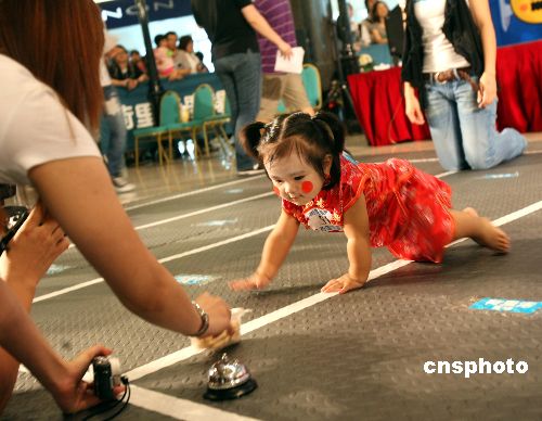 二十八日,香港一百多位5-12個(gè)月的BB打扮成各種模樣,在荷里活廣場(chǎng)參加“嘩鬼BB爬行大比拼”比賽,慶祝萬(wàn)圣節(jié)的到來(lái)。圖中BB的父母?jìng)優(yōu)閰⒓舆@項(xiàng)活動(dòng)精心打扮孩子,使出渾身解數(shù)引誘BB向前爬行。香港多家商場(chǎng)今日借輕松而又有趣的萬(wàn)圣節(jié)做宣傳主題,帶動(dòng)商場(chǎng)人氣熱旺。中新社發(fā) 王麗南 攝