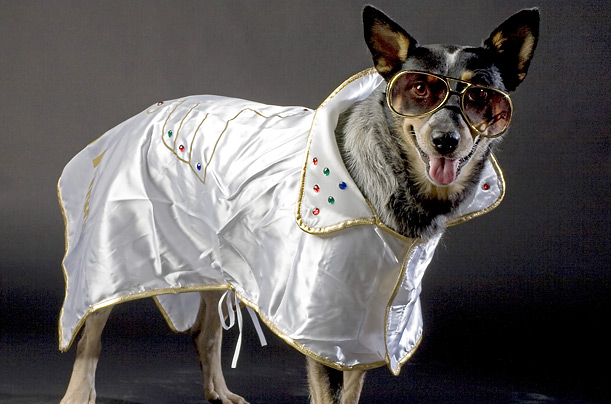 圖片九:身著華麗的白色演出服,戴著酷酷的遮住半個(gè)臉的大墨鏡,你想起誰了?“貓王”?沒錯(cuò),圖片中,這只獵犬便被他的主人打扮成了這幅模樣,它的主人一定是貓王的追隨者。(鐘巖)