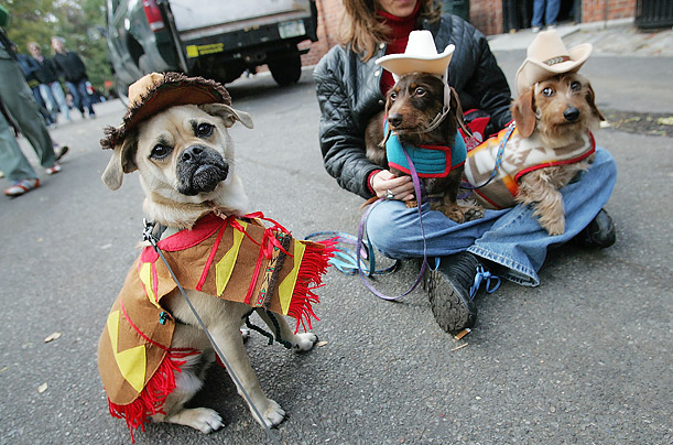 圖片十:在紐約城湯普金斯廣場公園舉行的規(guī)模最大的萬圣節(jié)小狗大游行中,三只小狗被打扮成牛仔的模樣,在人群中招搖過市。(鐘巖)