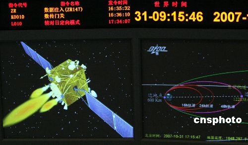 北京時間十月三十一日十七時十五分,北京航天飛行控制中心成功對“嫦娥一號”衛(wèi)星實施第三次近地點變軌,衛(wèi)星順利進入地月轉(zhuǎn)移軌道,由此真正開始了她的奔月之旅!版隙鹨惶枴毙l(wèi)星發(fā)動機開始工作七百八十四秒后,正常關(guān)機。北京航天飛行控制中心對各項測量數(shù)據(jù)的計算表明,衛(wèi)星變軌成功,由繞地飛行軌道進入地月轉(zhuǎn)移軌道。中新社發(fā) 孫自法 攝